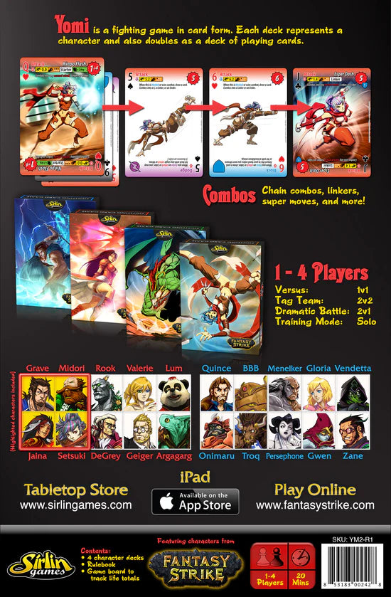 Yomi is a fighting game in card form where physical dexterity is replaced by hand management skills. Just like in a fighting game, you have to know your character, know the matchup, and know your opponent. Each character has a deck that follows the same conventions as a deck of playing cards. This makes it easy to learn the contents of your deck: numbered cards are normal moves, face cards are special moves, and aces are super moves.