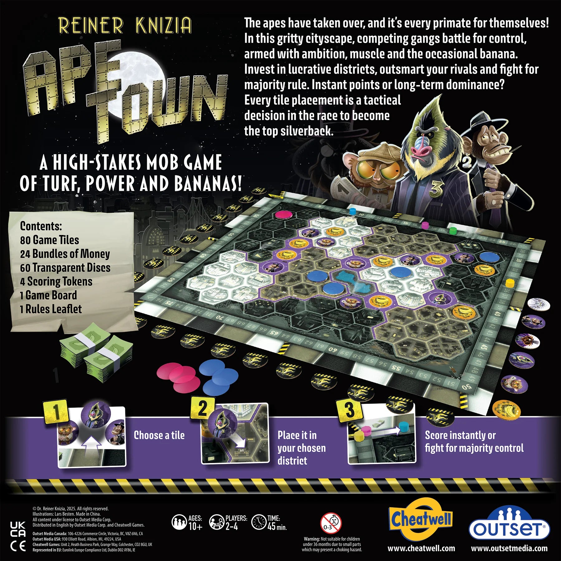 Ape Town by Reiner Knizia is a high stakes mob game of turf, power, and bananas! The apes have taken over and it's every single primate for themselves! In this gritty cityscape, competing gangs battle for control, armed with ambition, muscle and the occasional banana. Invest in lucrative districts, outsmart your rivals, and fight for majority rule. Instant points or long-term dominance? Every tile placement is a tactical decision in the race to become the top silverback.