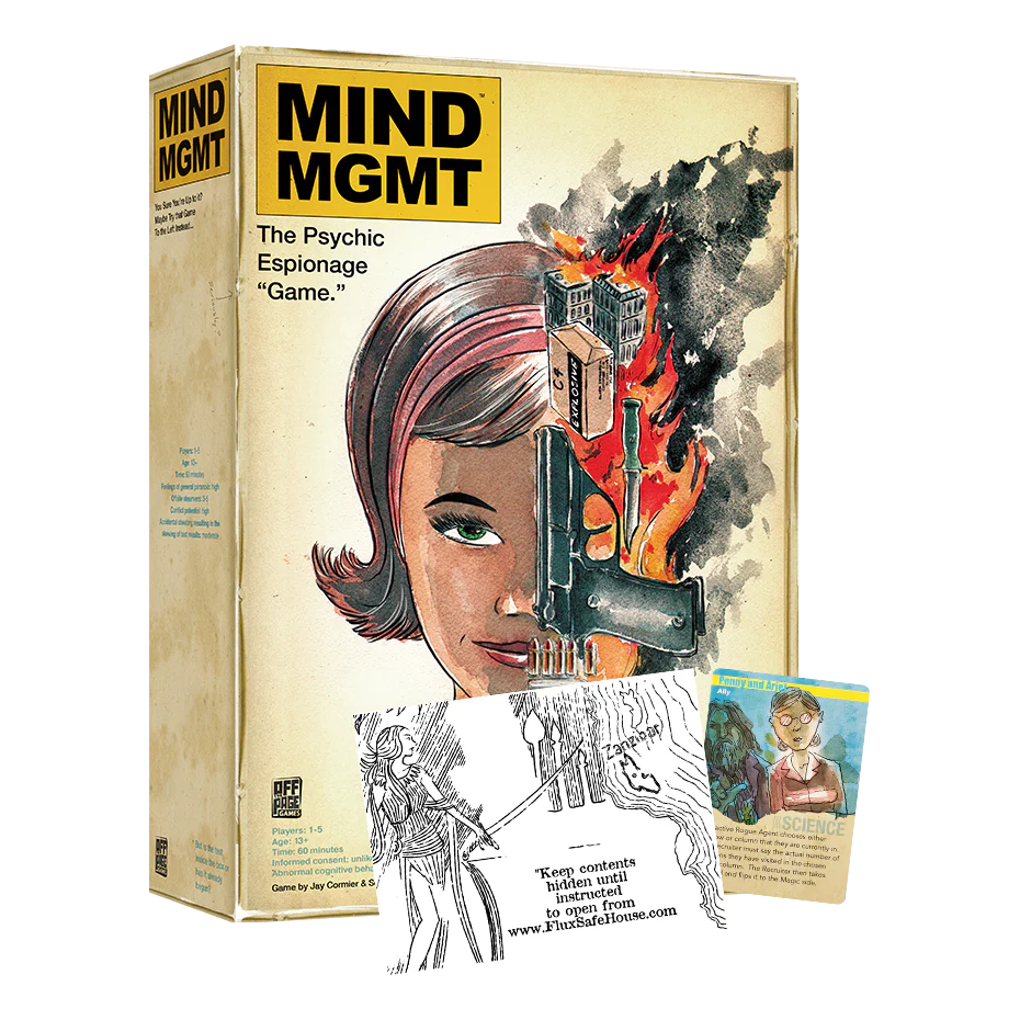 In Mind MGMT: The Psychic Espionage "Game.", one player controls Mind MGMT and must scour the city for new recruits. They move around on a secret map, trying to visit locations that match one of their three randomly drawn feature cards. They can also use their four Immortals to protect locations from being exposed.