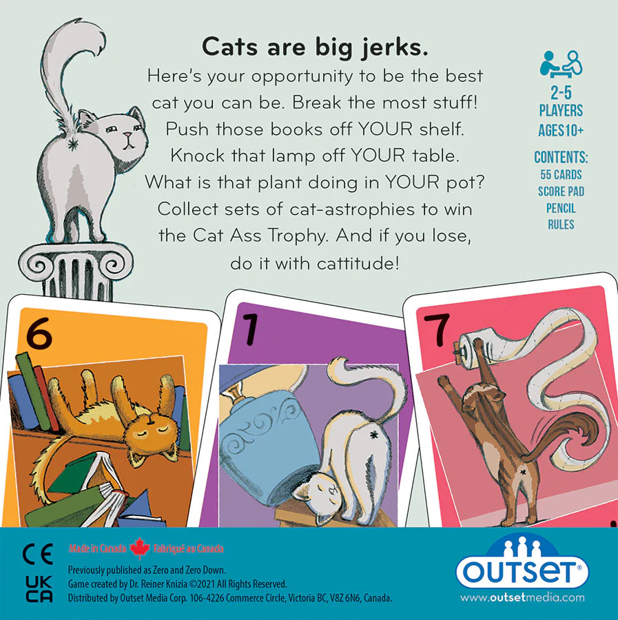 Cats are ass%*@s. Here's your opportunity to be the best cat you can be. Break the most stuff! Push that wine glass off YOUR countertop. Knock that lamp off YOUR table. What is that plant doing in YOUR pot? Collect sets of cat-astrophies to win the Cat Ass Trophy.