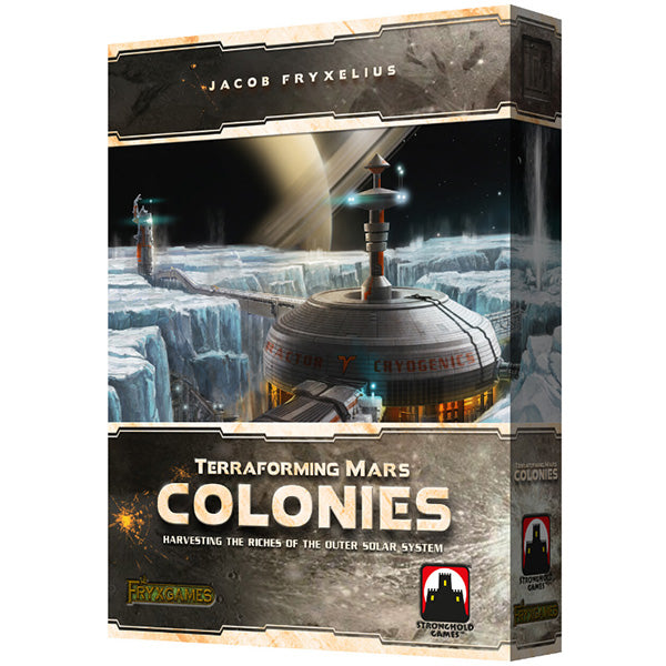 Terraforming Mars: Colonies, an expansion for Terraforming Mars that can be played with only the base game or with any combination of expansions, lets you visit the outer solar system. It features colony tiles where you can build colonies and send your trade fleet. It also includes new cards and corporations.